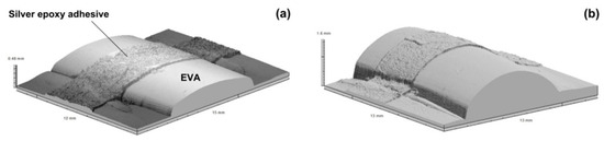 3D surface scanning results of ethyl-vinyl alcohol (EVA) after programming and coating with silver epoxy adhesive (a) and after heating for shape recovery (b). The height of the EVA protrusion increases from 0.48 mm to 1.6 mm after heating.