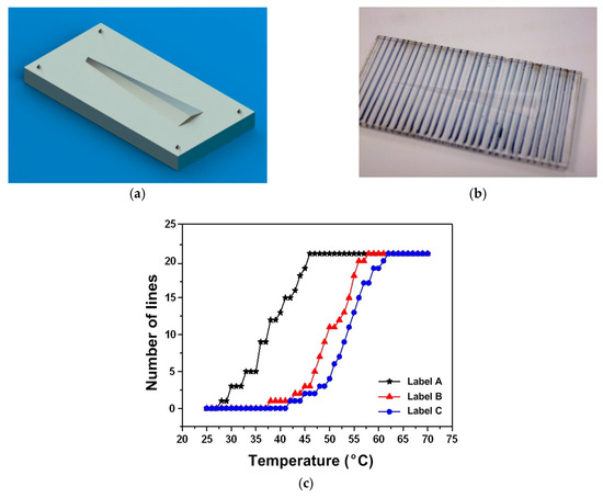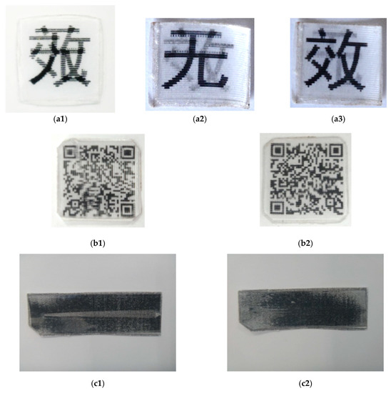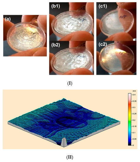 Figure 5a presents a commercial anti-counterfeit SMP label (from Guangzhou Manborui Material Technology Co., Ltd., Guangzhou, China) before and after heating in 65 °C oven for two minutes to get the embossed feature recovered. 3D surface scanning using a Taylor scanner reveals that the embossed feature, which indicates authentic in Chinese, is about 0.1 mm in height, which is about the same magnitude as that of the surface feature in standard bank coins and can be clearly identified via tactile sensation by fingers.