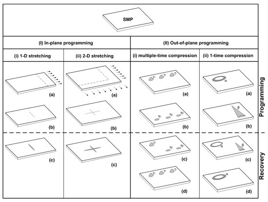 A piece of SMP film/sheet may be programmed in the in-plane direction (load applied in the length/width direction) or out-of-plane direction (load applied in the thickness direction). Readers may refer to, for instance, References [25,53,89], for the details of various approaches to program different types of polymeric materials.