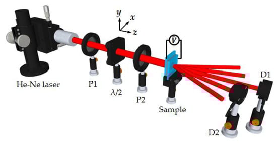 A real-time probe technique was employed to detect the dynamic process of the diffraction grating. As shown in Figure 1, a He-Ne laser with a pair of polarizers and a half-wave plate was aligned as the probe beam. The diameter of the probe beam was about 3 mm. Arbitrary intensity and arbitrary linear polarization of the probe beam can be obtained by properly adjusting the half-wave plate and polarizer. An alternating current (AC) field with frequency of 1 kHz was applied on the sample to induce the reorientations of liquid crystal molecules and thus to form the diffraction grating. Two photo detectors (ET-2040, from EOT, Traverse, MI, US) were set behind the sample to receive the zero-order and first-order signals, respectively. It should be noted that the orientation for the period of the grating electrode was set in the x-axis, while the initial orientation of liquid crystal molecules was along the y-axis, as seen in the coordinate provided in Figure 1. The polarization of the probe beam was set to be parallel to the y-axis.