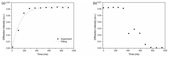 Figure 3a shows the first-order diffraction as a function of time during the period between 0 to 1000 ms with an applied voltage of 5.0V. The diffraction signal rapidly rises to a stable level. The rising curve of the signal versus time can be fitted by a single exponential function as in Equation (3):