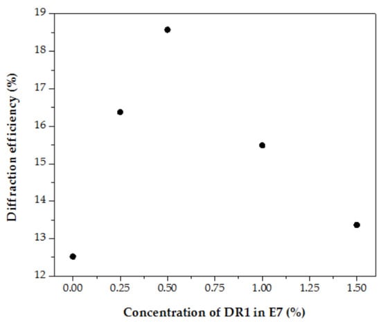 Diffraction efficiency of the first-order diffraction as a function of the concentration of azo dye. The devices are operated under an applied voltage of 5.0 V.