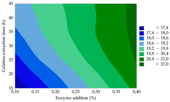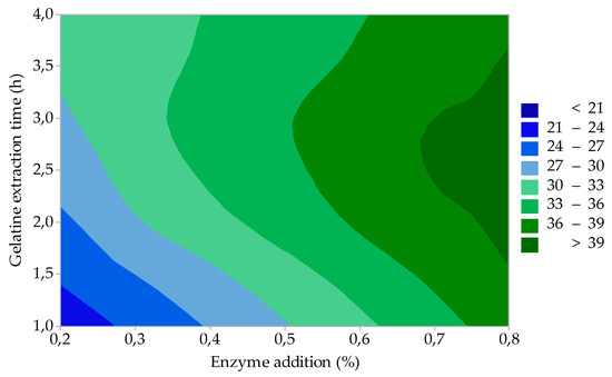 The results of the statistical evaluation showed that only factor A (enzyme addition) is statistically significant for the yield of gelatine (GY). The effect of the two most important process factors (enzyme addition and gelatine extraction time) on GY is represented by the contour graph in Figure 1. It is evident that with increasing enzyme addition and at the same time extending the extraction time, GY increases. This trend is particularly evident at lower enzyme additions (up to about 0.4%) and at shorter extraction times (up to about 2.5 h). There is no significant GY growth with any addition of enzymes above 0.5% or extraction time more than 2.5 h. The minimum GY (≈ 21%) is reached under the lower limit of the factors of interest, i.e., 0.2% enzyme addition and 1.0-h extraction time. The maximum GY (≈ 38%) then corresponds to approximately 0.7% enzyme addition and 2.5 h; further increasing the extraction time will no longer affect the increase of GY.