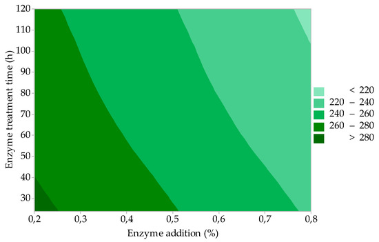 The results of the statistical evaluation showed that all three studied factors are statistically significant in the strength of gelatine gel (F); the influence of factor A (enzyme addition) and factor B (enzyme treatment time) on F is represented by the contour graph in Figure 2. It can be seen from the figure that high-quality gelatines (F = 220–280 Bloom) can be prepared within the limits of the process factors studied (0.2–0.8% enzyme addition and raw material enzyme processing for 30 to 120 h). Under the lower limit of the observed factors (0.2% enzyme addition and 30-h enzyme treatment of the raw material, gelatine with F > 280 Bloom can be prepared with a 21% yield of gelatine (see Figure 1). With an almost double yield of gelatine (GY = 38%, see Figure 1) under the upper limits of the observed factors (0.8% enzyme addition and 120-h enzyme treatment of the raw material), it is evident that there is no significant decrease in F: gelatine still has a high gel strength (F ≈ 220 Bloom). The standard specifications for food gelatines prescribe F = 150–280 Bloom, depending on the method of application. For the production of hard gelatine capsules (HGC), F = 200–280 Bloom is prescribed; gelatines with a gel strength of 130–200 Bloom are sufficient for soft gelatine capsules (SGC).