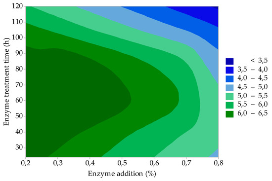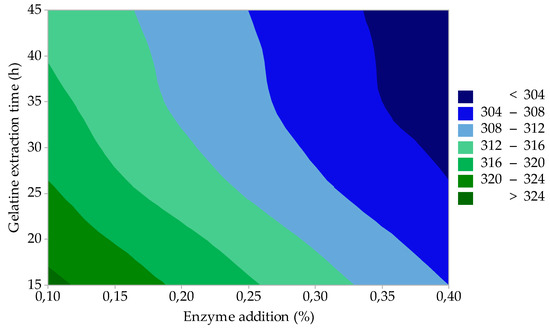 The results of statistical evaluation showed that factor A (enzyme addition) and factor B (enzyme treatment time) are statistically significant for gelatine viscosity (η); the influence of these process factors on η is represented by the contour graph in Figure 3. It is evident from the figure that η is the highest (>6.5 mPa·s), and at the same time, its value is not influenced by the change of these technological factors at low enzyme addition (0.2–0.3%) and at short enzymatic treatment times (within 90 h). It is also evident from the graph that with increasing enzyme addition (>0.4%) and at short enzyme treatment times (up to ≈ 90 h), η gradually decreases to 5.0 mPa·s. Long enzyme treatment times (110–120 h) in combination with the highest enzyme additions (0.7–0.8%) mean an even more significant decrease of η (3.5–4.0 mPa·s). Gelatines with η 2.0–7.5 mPa·s cover a wide range of applications in the food industry. For the production of HGC, gelatines with a higher viscosity (4.5–6.5 mPa·s) are required. For SGC, it is 2.5–4.5 mPa·s, and for tablets, the viscosity of 1.7–3.5 mPa·s is sufficient. It can be seen from the viscosity measurement results that gelatines prepared under different process conditions meet the gelatine specifications for the production of HGC and SGC.