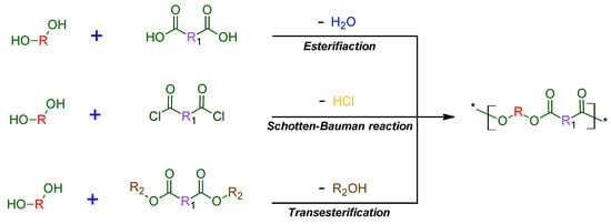 Polycondensation is characterized by a stepwise polymerization reaction involving difunctional monomers of the AB type, i.e., hydroxy carboxylic acids, or from a combination of AA and BB difunctional monomers resulting in the formation of a small byproduct, e.g., water [,]. Basically, examples of polycondensation reactions, which proceed using difunctional monomers are the esterification of diacids with diols, diacid chlorides with diols or the ester interchange reaction of diols with diesters (Figure 2) [,,,].