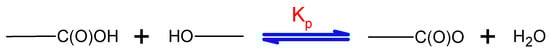 Therefore, the formation of the ester group during the polymerization process is characterized by an equilibrium reaction (Figure 3) and in order to prepare high molecular weight polymers, two major prerequisites must be fulfilled [,]. Firstly, the equilibrium constant of polycondensation (KP) must be sufficiently high and secondly, according to Equation (2) in case of heteropolycondensation (e.g., dialcohols and dicarboxylic acids) the stoichiometry (1:1) must be strictly obeyed.