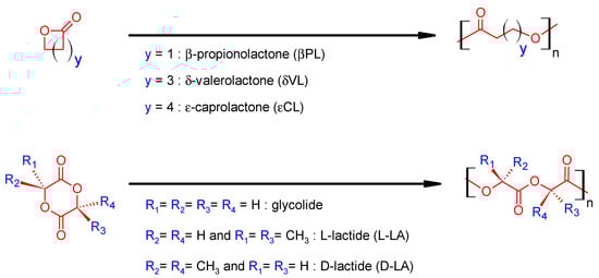 Nowadays, is with no doubt that ROP polymerization (e.g., of cyclic glycolide, lactides and lactones, Figure 4) is one of the most employed polymerization routes in order to circumvent the drawbacks from the polycondensation. The ROP polymerization processes several advantages compared to traditional condensation polymerization, e.g., high conversion without the necessity of removal of reaction byproducts, shorter reaction times, mild synthetic conditions and the use of a stoichiometric balance of monomers. Moreover, the ROP polymerization sometimes proceeds in a “living” manner, without side reactions, which allows good control of the polymer characteristics (narrow molecular weight distribution and predictable final molecular weight of polymer) [,,]. All these remarkable advantages make ROP the method of choice for the preparation of high-molecular weight aliphatic homo- and copolyesters.