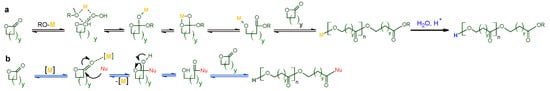 Mechanism of ROP of lactones using organometallics [M] as (a) an initiator in the “coordination-insertion” mechanism and (b) as a catalyst in the presence of nucleophiles (Nu) [].