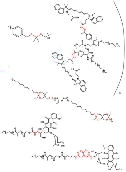 The pH-labile polyesters have found a wide range of applications in drug release for diseases where certain pH shift from the physiological pH is observed. Typically, the polymer degradation may be selective in this way in cancer and inflamed tissues (in the case of inflammation, the presence of reactive oxygen species is also used for specific drug release or polymer degradation, see below) []. While in the healthy tissues the pH value is around 7.4, in the cancer and inflamed tissue the pH value is significantly lower—around 6.5 []. It has also been shown that some cell compartments such as lysosomes or endosomes exhibit lower the pH to between 5 and 6 [,]. Many pH-labile systems have been developed so far and there is always a pH-sensitive functional group present in the structure. The most common bonds with such properties are the hydrazone bond [,,,,,], amine/imine groups [,], acetals/ketals [,], ortho esters [,], cis-aconityl group [,], etc. The selected pH-sensitive linkages are shown in Figure 6.