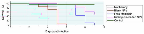 In vivo testing of antituberculotic nanobead-based intervention. Zebrafish larvae were infected with Mycobacterium marinum and treated with free rifampicin, rifampicin-loaded nanoparticles and blank nanoparticles at a dose of 10 mg/kg. Cumulative mortality is shown. Modified based on data from reference [].
