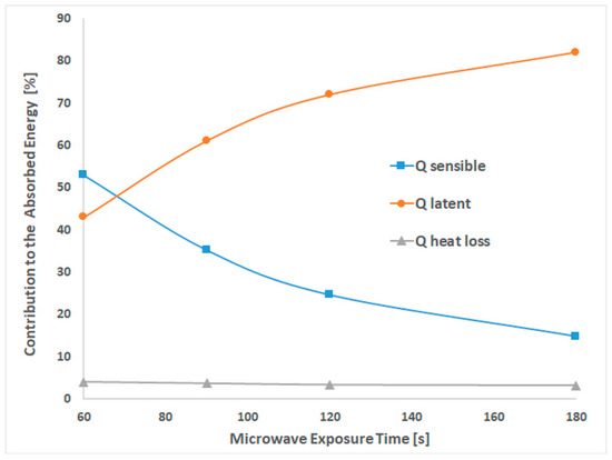 The sensible and latent heat contribution to the absorbed energy is almost the same, 53% and 43%, when the exposure time was up to 68 s. The contribution of latent and sensible heat is dependent on MW time exposure. The latent heat increases concomitantly with the decrease of sensible heat, suggesting that water evaporation occurred [13] even after 68 s, when the boiling temperature was still not reached.