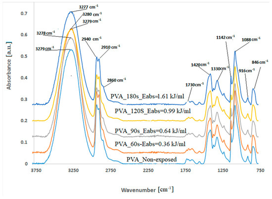 FTIR spectra of PVA foils revealed peaks from 1420, 916, and 846 cm−1, associated with the C–H bend of CH2, CH rocking, and C–O stretching, and the 1380–1330 cm−1 bands attributed to the combined frequencies of C–H and OH [15]. The stretching vibration of C–O from the C–O–C bond is ascribed to the peak from 1144 cm−1, and the stretching of C–O from the C–O–H bridge is present at 1088 cm−1 [16].