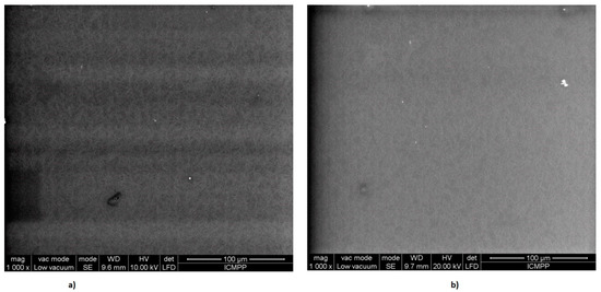 The morphology of the PVA thin foils was investigated using scanning electron microscopy (SEM). SEM images of PVA foils obtained before and after 180 s of MW irradiation of aqueous solutions are given in Figure 4.