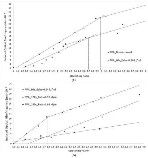 The dependence of the induced optical birefringence on the stretching ratio is represented in Figure 5a for PVA foils obtained before and after 60 s of MW irradiation and in Figure 5b for the foils obtained after 90, 120, and 180 s of MW exposure.