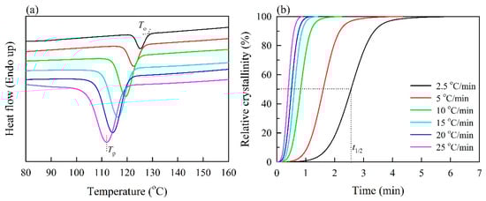 Nonisothermal crystallization behaviors of polypropylene with unmodified bamboo fibers. (a) Differential scanning calorimetry (DSC) thermograms. (b) Relative crystallinity as a function of time.