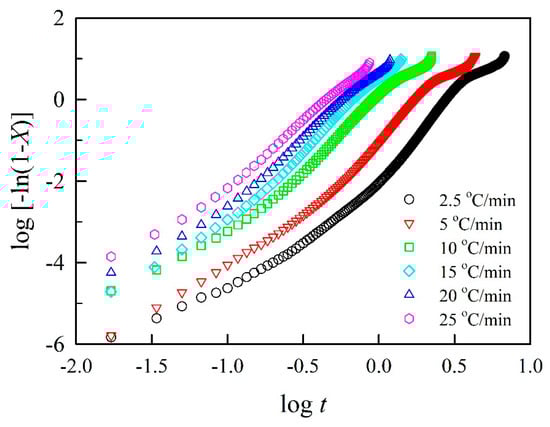 Based on the Avrami (Equation (5)) [,,] and Ozawa (Equation (6)) approaches [], the crystallization kinetics were determined using the following equations: