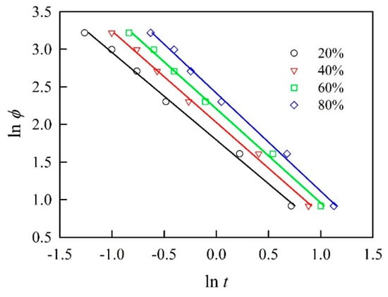 However, previous studies have reported that the Ozawa equation may not be appropriate for describing the nonisothermal crystallization kinetics of some polymer systems [,,]. Therefore, an equation related to the cooling crystallization rate (φ) and time (t) could be generated at a given degree of crystallization by combining the Avrami and Ozawa equations [,] as the following Equation (9):
