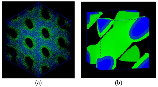 Three-dimensional morphology of the mesophase evolved from the generic test reflection given in Equation (12) in a simulation box (unit cell) of 5 × 5 × 5. Its image is depicted by using Mesodyn (a) and also by Matlab (b) just for comparison purposes. A domain as the dispersed phase is only drawn here.