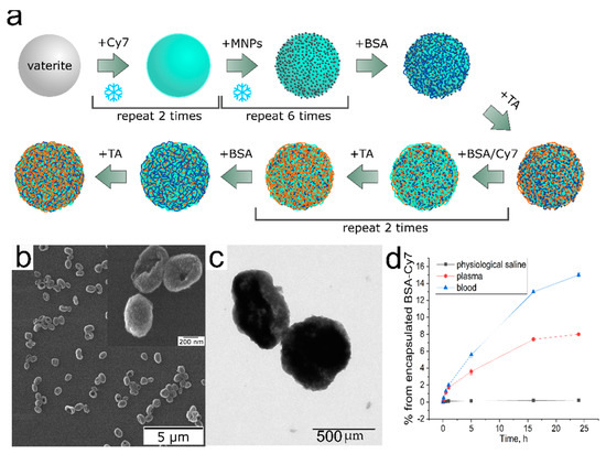 Vasir et al. showed that effective delivery of magnetic nanoparticles via systemic administration requires such a magnetic force as to compensate for the force of linear blood-flow rates of ~0.05 cm/s in the capillaries to 10 cm/s in the arteries and 50 cm/s in the aorta. To overcome this difficulty, magnetic nanoparticles with higher magnetic moments or magnets that can provide higher magnetic field gradients are required [30]. For increasing the loading of MNPs, FIL was used which consisted of the successive cyclic loading of MNPs and Cy7-conjugated BSA into vaterite particles. [31]. Figure 1 shows the obtainment of particles loaded with magnetite and with Cy7–BSA.