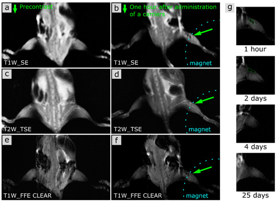 MR T1 and T2 images of the mouse. (b,d,f)—1 h after intravenous injection of a microcarrier suspension; (a,c,e)—control mouse without any injections. The dotted blue line shows the area of magnet application, (g)–T1W_FFE CLEAR images of paw 1 h, 2, 4, and 25 days after intravenous injection of a microcarrier suspension.