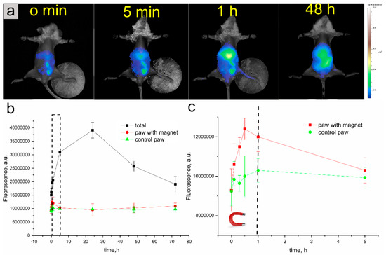 The organ distribution of carriers under the effect of a magnetic field applied to a mouse paw (real-time visualization). (a), whole-body fluorescence imaging and distribution of carriers before and after injection into the mouse tail vein. (b), change in the total fluorescence signal of the mouse and signals received from both paws within 72 h. (c), change in the fluorescence signal from the moment of carrier administration to 5 h (area marked with a dotted red line in Figure 4b).