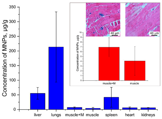 The magnetite tissue distribution measured by magnetometry. The predominant accumulation of magnetite in the lungs, liver and spleen. At the callout the concentration of magnetite in the intact muscle and the muscle exposed to the magnetic field as well as the histological picture of these muscles is presented (in insert). An increase in the concentration of magnetite by 70% compared with the intact limb was observed. Microaggregates of magnetite particles in the capillaries and venules were found.
