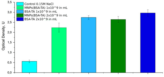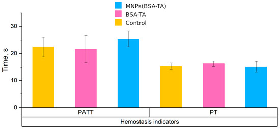 To evaluate changes in the coagulation properties of blood as a result of contact with carriers, we measured such coagulation indicators as prothrombin time (PT, an indicator of the external coagulation pathway) and activated partial thromboplastin time (APTT, an indicator of the internal coagulation pathway). These were measured with an Amelung KC4 coagulation analyzer (TRINITY Biotech, Ireland) in duplicate. Blood from four healthy donors was dispensed into tubes with sodium citrate as the anticoagulant and was incubated with particles (MNPs(BSA–TA) and BSA–TA). The scheme of the experiment was the same as described by Dobrovolskaia et al. [29]. A solution of 0.9% NaCl was used as the reference. After incubation, plasma was isolated by collecting the supernatant liquid and was subjected to clotting tests.