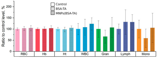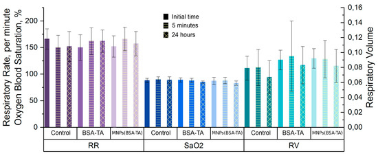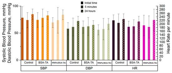 In all groups, there was a tendency for an increased heart rate at the point “24 h”; however, this effect was not statistically significant. At this point, we observed an increase in systolic and diastolic blood pressure in the group receiving MNPs(BSA–TA) and an increase in diastolic blood pressure in the control group. We believe that the increase in blood pressure is not a specific effect of the carriers but the result of the stress underwent by the animals the day before. This assumption was confirmed by the fact that similar changes were noted both in the experimental group and in the control group and by the tendency for an increased heart rate in all groups at the point “24 h.”