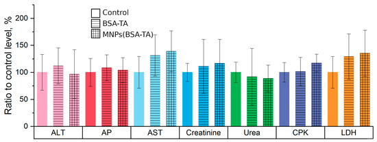 Heart damage markers have also been determined to assess the effects of the microcarriers on the cardiovascular system. We can observe a moderate but statistically significant increase in the level of aspartate aminotransferase (AsT) and lactate dehydrogenase (LDH), as well as a tendency for an increased creatine phosphokinase (CPK) level in the group receiving MNPs(BSA–TA). Furthermore, a tendency for increased levels of AsT and LDH was detected in the animals receiving BSA–TA carriers, but it was not confirmed statistically. This results may indicate subclinical myocardial damage, not manifested as violations of the hemodynamics or heart rhythm. Myocardial damage may be due to the above-mentioned activation of LPO and to immune inflammation. A combination of these factors is possible, but the induction of free-radical processes mediated by iron seems to play a more important role, as compared to the activation of nonspecific immune responses. This is evident from the fact that there were no significant symptoms of systemic inflammation such as leukocytosis, tachycardia, and/or arterial hypotension.