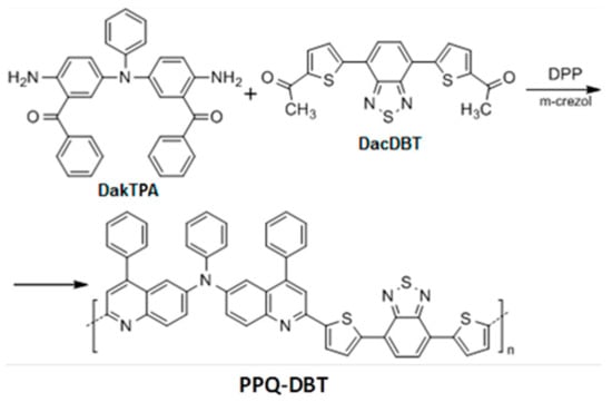 - Agrawal, A.K.; Jenekhe, S.A. Synthesis and processing of heterocyclic polymers as electronic, optoelectronic, and nonlinear optical materials. 2. New series of conjugated rigid-rod polyquinolines and polyanthrazolines. Macromolecules 1993, 26, 895–905. [Google Scholar] [CrossRef]
