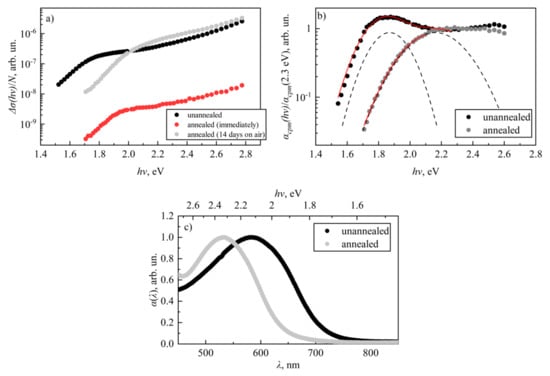 - Malov, V.V.; Tameev, A.R.; Novikov, S.V.; Khenkin, M.V.; Kazanskii, A.G.; Vannikov, A.V. Gaussian approximation of the spectral dependence of the absorption spectrum in polymer semiconductors. Semiconductors 2016, 50, 482–486. [Google Scholar] [CrossRef]