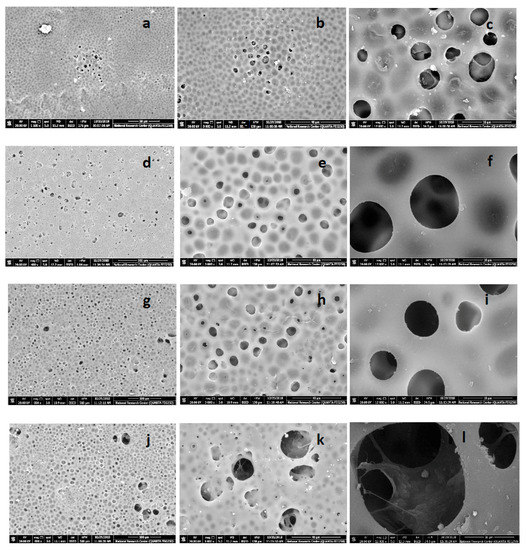SEM image of surfaces of PSF (a–c), PSF/0.5% RSNF (d–f), PSF/1% RSNF (g–i), and PSF/2% RSNF (j–l) membranes at 800, 3000, and 12000x magnification, respectively (scale bar is 50, 40, and 10 µm, respectively).
