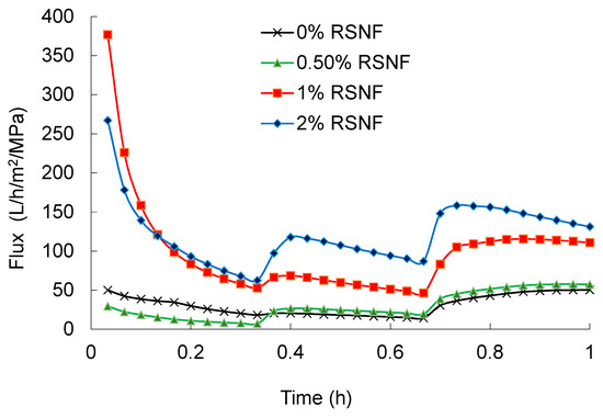 Regarding fouling of the membranes, as shown in Figure 6, after three cycles of passing protein solution and pure water across the membranes for one hour, water flux values of 2.7 ± 0.26, 8.9 ± 1.75, 18.6 ± 2.48, and 61.3 ± 4.4 L/h/m2/MPa were recorded for neat PSF, PSF/0.5%RSNF, PSF/1%RSNF, and PSF/2%RSNF, respectively.