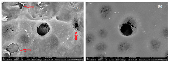 SEM of the PSF/2%RSNF membrane surface: (a) after water flux test and (b) before water flux test.