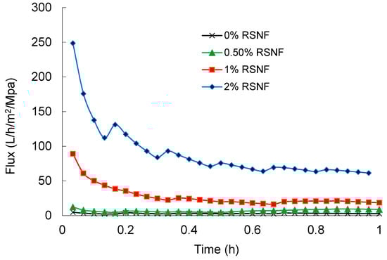 Water flux of PSF and PSF/RSNF membranes with different loadings of RSNF.