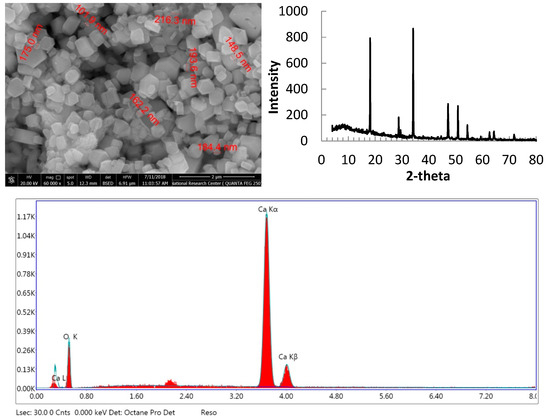 TEM, XRD pattern, and energy-dispersive X-ray spectroscopy (EDS) spectrum of lime nanoparticles.