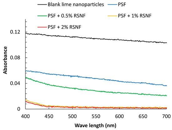 Figure 8 shows visible light absorbance of the filtrate solution after passing through PSF membranes, as well as that of lime nanoparticles suspension with 1 g/L concentration. Interestingly, as shown in the figure, the rejection of lime nanoparticles increased with increasing RSNF content in spite of the increase of diameter of the pores at the surface and porosity of the membranes containing RSNF. The filtrate obtained from filtration using the neat PSF membrane showed a 60% decrease of light absorbance at 600 nm as compared to the blank lime suspension; filtrates obtained from filtration using PSF/0.5%RSNF, PSF/1%RSNF, and PSF/2% RSNF showed 76%, 97%, and 98% decrease in light absorbance, respectively. According to standard curve of lime nanoparticles with different concentrations (not shown), the concentration of lime nanoparticles in the filtrate was 17.4, 11.1, 1.3, and 0.9 mg/L when using PSF, PSF/0.5%RSNF, PSF/1%RSNF, and PSF/2% RSNF membranes, respectively. The increase in rejection of lime nanoparticles with increasing porosity and pore radius at the surface of membranes as the RSNF content increase means that the rejection of lime nanoparticles is not simply by mechanical filtration but involves interaction between the nanoparticles and the functional groups at the RSNF surfaces. RNSF with its very high surface area has plenty of hydroxyl and carboxylic functional groups at their surface which can attract the charged lime nanoparticles. Similar observation was found in previous work in case of using microcrystalline cellulose, cellulose nanocrystals or cellulose nanofibers isolated from bleached pulps when rejection of bovine serum albumin (BSA) was studied [25,27,36]. Although addition of cellulose nanocrystals or nanofibers to PSF resulted in increasing porosity and water flux, rejection of BSA (protein with charged surface) did not significantly affect by the increased porosity or water flux.