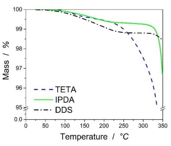 The T1% (temperature at which the weight loss of 1 wt% occurs) of DGEBA-TETA system was determined as 219 °C, for DGEBA-IPDA around 228 °C, and finally for DGEBA-DDS above 250 °C. The T5% is above 250 °C for all samples. A slight mass loss with increasing temperature was observed for all types of resin systems but to a different extent in accordance with the higher stability of the aromatic hardener structure. TETA-cured epoxy resin showed the highest mass loss compared to the other resins. As the mass loss is very low, it should be attributed to the loss of water and volatile chemical groups on the surface of the samples.