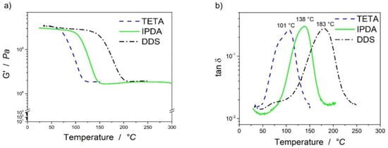 Clearly, these theoretical considerations do not take the topology of the networks into account [10]. To deepen the understanding regarding the thermo-mechanical behavior of these polymers, the network densities were calculated using the equations from Koleske stated in the theory part. Figure 3b highlights the loss tangent values measured by the dynamic mechanical thermal analysis (DMTA). The maximum of loss tangent was measured for the TETA-cured epoxy system at 101 °C, for IPDA at 138 °C and for DDS at 183 °C.