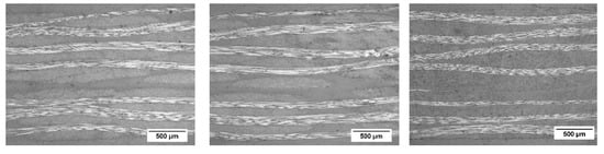 Since the ultrasound scan has a minimum resolution of 5 microns, additionally, the through-thickness laminate quality was further analyzed via optical microscopy. The micrographs are shown in Figure 5. The fiber bundles of 0 and 90° for all types of laminates are clearly observable. Microstructures of all types of laminates seem to be comparable and no laminate defects or air bubbles were observed.