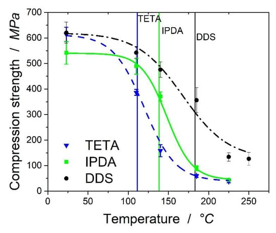 where is the compressive strength at the plateau before the decrease and after decrease. is the temperature where 50% of the mechanical properties remain, and is a material constant which needs to be fitted. The calculated values can be found in Table 6. Figure 6 shows the fitted curves with the calculated values. For TETA and IPDA, R2 is ~99%, which proves appropriate fittings could be found. DDS assumes an R2 of 96.9%.