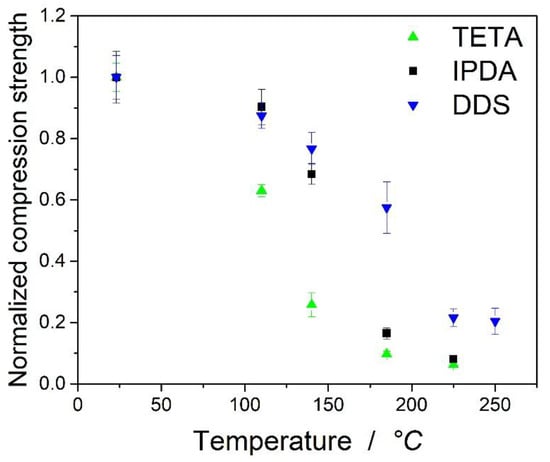This is also visible in Figure 7, which shows the normalized compression strength relative to the strength at room temperature. It should be mentioned that at higher temperatures (>180 °C), the differences between the samples based on TETA and IPDA were marginal. As the remaining mechanical strength at these temperatures was at a very low level, the fibers and the test setup of the Celanese compressive test may play an important role. The remaining properties at higher temperatures are therefore based on the textile and not on the epoxy matrix of the samples. DDS showed a slightly higher remaining compressive strength above the maximum of the loss tangent, which may be attributed to higher G’ at the plateau after the decrease of the compressive strength.