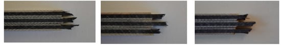 Furthermore, the failure modes of the laminates were analyzed. Robinson presented typical failure mechanisms in polymer matrix composites, which were evaluated [7]. Figure 8 shows optical photographs of the destroyed samples, tested at room temperature, 80 °C, and 225 °C (from top to bottom). It can be seen that all tests are valid, as the failure occurred between the clamping. For all samples, a kink band formation seems to be the reason for the failure in compressive tests. They usually start at the point of highest stress and continue in a specific angle to the other side of the sample. From the photographs, no significant differences between the samples based on TETA, IPDA, and DDS could be found.