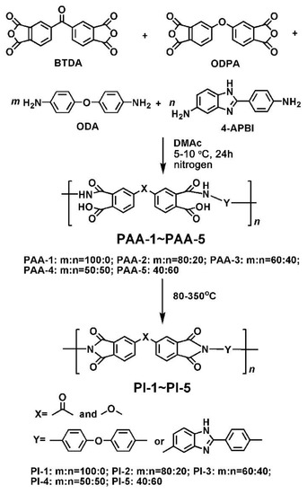 4,4’-Oxydiphthalic anhydride (ODPA) and 3,3’,4,4’-benzophenone tetracarboxylic acid dianhydride (BTDA) were purchased from Tokyo Chemical Industry Co., Ltd., Tokyo, Japan and dried in vacuo at 180 °C for 12 h prior to use. ODA was purchased from Wakayama Seika Kogyo Co., Ltd., Wakayama, Japan and used as received. 2-(4-Aminophenyl)-5-amino-benzimidazole (4-APBI) was purchased from Changzhou Sunlight Pharmaceutical Co., Ltd., Jiangsu, China and used as received. N,N-dimethylacetamide (DMAc) was purchased from Beijing Yili Fine Chemicals, Beijing, China, distilled prior to use, and stored under a 4 Å molecular sieve. The other commercially available reagents were used without further purification.