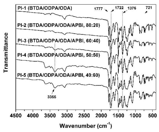 The chemical structure of the PI coatings was confirmed by the FT-IR measurements and the spectra are shown in Figure 2. In the spectra, the characteristic absorptions of the imide rings at 1777 (υas,C=O), 1722 (υas,C=O), 1376 (υas,C-N), and 721 cm−1 (C=O bending) were clearly observed, respectively. In addition, the peaks around 3355 cm−1 for the characteristic absorption of –NH– bonds in benzimidazole rings were recorded for PI-2–PI-5, indicating the successful incorporation of the benzimidazole units in the polymers. Meanwhile, the characteristic absorption of the amide carbonyl in PAA at 1640 cm–1 disappeared in the spectra, indicating the successful conversion from PAA to PI via high-temperature imidization reaction.