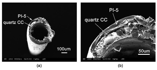 The appearance of the PI-coated CC samples and the pristine quartz rod is shown in Figure 4. It can be seen that PI coating exhibited good flexibility and toughness, which made it possible to wind the brittle quartz CCs with a curvature radius of 10 cm or even below. The microscopic morphology of the PI-protected quartz CCs was investigated by FE-SEM measurements and the typical photographs of the PI-5-protected sample are illustrated in Figure 5. The average inner diameter of the quartz CCs was 250 um and the thickness of the PI protective coatings was around 25 um. The PI coating adhered with the inner quartz column tightly, and no apparent delamination and cracking occurred. These micrographs also showed that the fracture profile of the PI-coated columns exhibited a typical ductile fracture pattern, indicating good flexibility and toughness of the coatings. At last, the good adhesion of the PI coatings with the quartz CCs was also related to the matched CTEs of the coating with the substrate, which is discussed below.