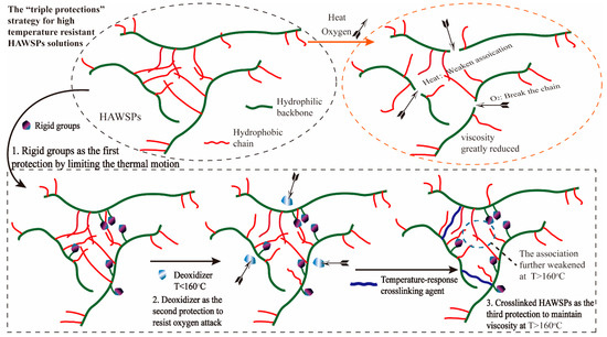 Schematic of the “triple-protection” strategy to enhance the high temperature resistant performance of hydrophobic associative water-soluble polymers (HAWSPs).