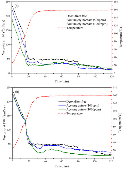 Deoxidizers have been intensively studied in various industries, for example, deoxygenation and corrosion prevention of boilers. Commonly used deoxidizers can be classified into inorganic and organic types. Inorganic deoxidizers include sodium sulfite, sodium thiosulfate, hydrazine, etc. Organic deoxidizers include carbohydrazide, acetaldehyde oxime, acetone oxime, D-isoascorbic acid, sodium D-isoascorbate, and so on [14]. In order to overcome the environmental disadvantages of surfur-containing oxygen scavengers which can produce toxic gases at high temperature and hydrazine scavengers itself is strongly toxic, carbohydrazide, acetone oxime, sodium D-isoascorbate, and other environmentally-friendly agents have been widely used. Use of deoxidizers to improve the high temperature resistance of fracturing fluids has long been studied. For example, Pakulski and Gupta (1994) improved the temperature resistance of guar fracturing fluids to 150 °C by adding methyl ethyl oxime [15]. Gupta and Carman (2010) further showed that chalcogen heterocyclic compounds containing oxygen or sulfur are helpful for extending the high temperature effectiveness of aqueous gels [16]. It was found that these compounds can prevent the thermal degradation of gels at temperatures as high as 205 °C. The sterically unhindered oxygen atom on the heterocyclic compound carries two unshared pairs of electrons, which can be donated and reduce oxygen free radicals to maintain the gel stability. But some reducing agents can lead to faster degradation of the polymer chains [12], so it is necessary to investigate whether a deoxidizer is compatible with the acrylamide-based polymers.