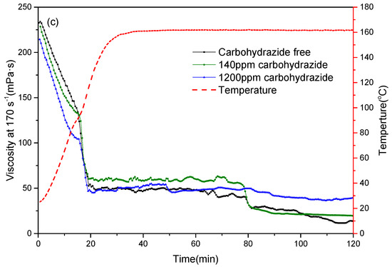 For acrylamide-based polymers, compatible temperature stabilizers are important because improper temperature stabilizers may react with polymers and lead to faster degradation [12]. Therefore, deoxidizers were first screened, including acetone oxime, sodium erythorbate, and carbohydrazide (Figure 7a–c). Comparing with the deoxidizer-free solutions, acetone oxime and sodium erythorbate resulted in lower viscosity while carbohydrazide performed the best in maintaining the solution viscosity. It can be seen that with a concentration of 1200 ppm carbohydrazide, the solution viscosity leveled out during the whole testing period (Figure 7c).